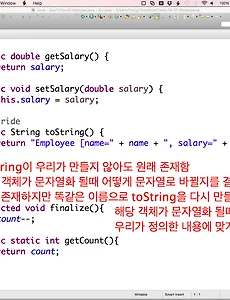 Programming55 2016.3.31 형변환s를 통하여 Rectangle 클래스의 필드와 메소드를 사용하고자 할 때는 어떻게 해야 하는가?( (Rectangle) s).setWidth(100); 부모클래스 타입으로 자식객체를 참조했을때는 부모클래스에 존재하는 멤버변수와 멤버함수만 접근가능자식영역에만 존재하는 멤버에 접근불가 → 자식클래스로 형변환을 통해 자식에만 존재하는 멤버에 접근 가능 [참조변수] instanceof [타입]→ 참조변수가 타입의 객체를 참조할수 있다면 true 아니면 false 추상클래스 : 추상메소드를 갖고있는 클래스 , abstract키워드를 붙여줌 추상메소드 : 몸통이 없는 메소드자바에서의 추상메소드는 abstract키워드를 붙여줌 추상클래스를 상속받으면 추상메소드를 구현해야만 하는 의무를 갖게됨 추상클래스를 상속받.. 2016. 3. 31. 2016.3.30 ↓ 변수+함수 / 상속 / 다형성 GoF디자인패턴↓ Spring * 상속: 어떤 클래스가 다른 클래스의 멤버변수와 멤버함수를 물려받는 것- 장점 상속을 통하여 기존 클래스의 필드와 메소드를 재사용변경 가능복잡한 GUI 프로그램 만드는데 유리함검증된 소프트웨어 재사용신뢰성있게 손쉽게 개발 유지보수코드의 중복을 줄일수있다 - 수퍼클래스(부모클래스) - 서브클래스(자식클래스) Ex> Animal - Lion,Dog ...Car - SportsCar 부모클래스로 객체 찍어내고 거기에 이어붙여서 자식으로 객체 찍어내고 붙여서 하나의 객체를 만들어내는 것 private - 내부에서만 접근 가능한 키워드 but, 상속받은 자식의 영역에서도 접근이 불가protected - 같은패키지와 자신을 상속받은 자식의 클래스영역.. 2016. 3. 30. 2016.3.29 * 접근제어publicprivate 2016. 3. 29. 2016.3.28 멤버 변수, 멤버 함수 : 클래스를 구성하는 구성요소로 클래스를 통해 객체를 생성하면 각 객체마다 멤버변수와 멤버함수들이 생성 정적 변수(static 변수) : 멤버변수와 다르게 객체를 생성하지 않아도, 아무리 많이 생성해도 한개만 존재하는 변수 정적변수의 이용 1. 모든 객체가 하나의 데이터를 공유하기위해서 2. 각각의 객체가 항상 같은 값을 가질 변수이기 때문에 각자 공간을 가질 필요는 없음 * 지역변수 : 메소드 내에서 생성하는 변수, 메소드 종료시 사라짐, 스택영역에 생성됨 Ex>public class CircleTest {public static void main(String[] args) {Point p1 = new Point();Point p2 = new Point(2,3);Circle c1.. 2016. 3. 28. 2016.3.25 getter/ setter 생성자특징 4가지 This 메소드 오버로딩 2016. 3. 25. 용어(정리중) JDK 자바 만들기위한거JRE 자바 실행하기위한거 CLI : Command Line InterfaceGUI : Graphic User Interface dir : dos 기반 CLI에서 현재 폴더의 리스트를 출력 컴파일 : 사람이 프로그래밍언어의 문법에 맞춰 작성한 소스코드를 컴퓨터가 실행가능한 기계어로번역 에디터 프로젝트 : 이클립스에서 작성한 하나의 프로그램 주석 : 컴파일러가 번역을 할때 무시하는 내용들 CPU(중앙처리장치) → 연산장치메모리(기억장치) → 저장장치HDD(보조기억장치) → 저장장치 -함수의 구성요소몸통 : 이 함수가 호출됐을때 실행해야 될 문장집단매개변수 : 함수가 실행될때 전달받는 입력 값반환값 : 함수가 끝나고 돌려줘야 되는 값 변수 : 값을 담는 바구니인데, 값의 유형에 따라 .. 2016. 3. 24. 이전 1 ··· 4 5 6 7 8 9 10 다음